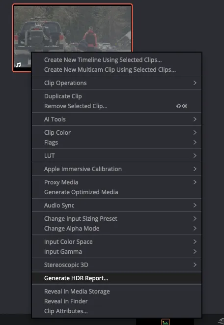 - Clic droit sur le fichier HDR du mediapool ➧ generate HDR Report.
