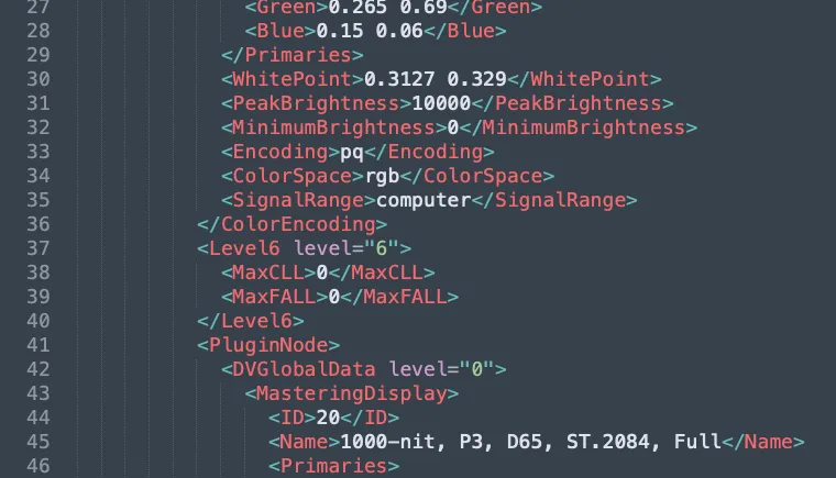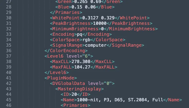 On retrouve ces mêmes informations dans les métadonnées Dolby Vision L6. Malheureusement l’export d’XML Dolby Vision de Resolve a toujours ces valeurs à 0.