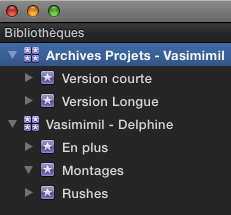 Que se soit en court ou en fin de montage, l’archivage ou la sauvegarde de son travail est très important. Il permet une sécurité et une souplesse plus grande. Revenir à montage ou faire le ménage dans tous les rushs. Final Cut à une fonction de sauvegarde de bibliothèque. mais trop peu paramètrable. Il vaut mieux le faire soit même « à la main ». En étant un tant soit peu rigoureux, c’est un jeu d’enfant.