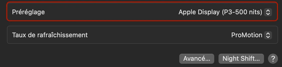 Bien penser à désactiver le Night Shift… Dans ce cas les Préférences Système ➧ Moniteurs ne permettent pas de régler le profils de la dalle du moniteur mais bien de simuler un moniteur (à une norme bien précise).
