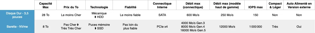 En version externe , ils sont souvent dans un boitier peu onéreux équipé d’une connectique USB-C (1000 Mo/s). Malheureusement ça bridera les nvme.