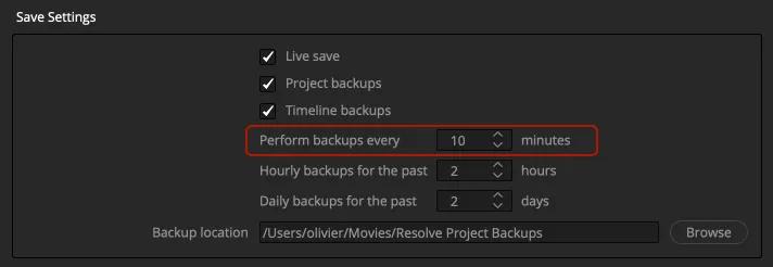 - « Perform backup every » est la fréquence des sauvegardes automatiques de projets/timeline sur la dernière heure écoulée.