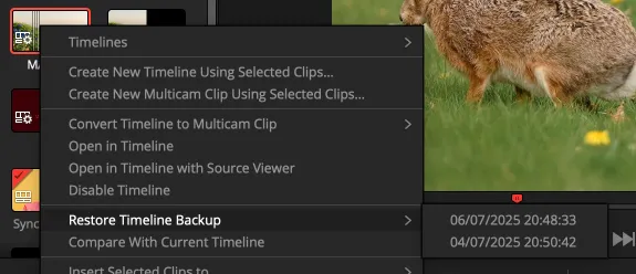Dans le mediapool de la page EDIT Il peut être intéressant de faire Clic droit sur la timeline d’origine ➧ Compare With Current Timeline