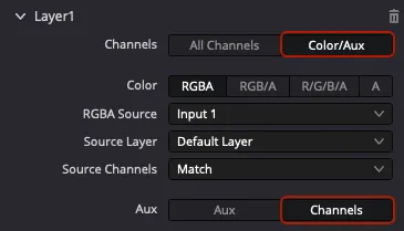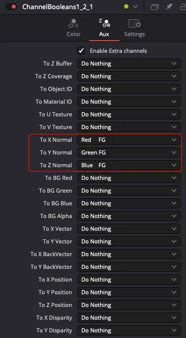 Chaque channel boolean est réglé pour faire correspondre les canaux RVB des fichiers de passes auxiliaires aux canaux Auxiliaires qu’ils sont réellement