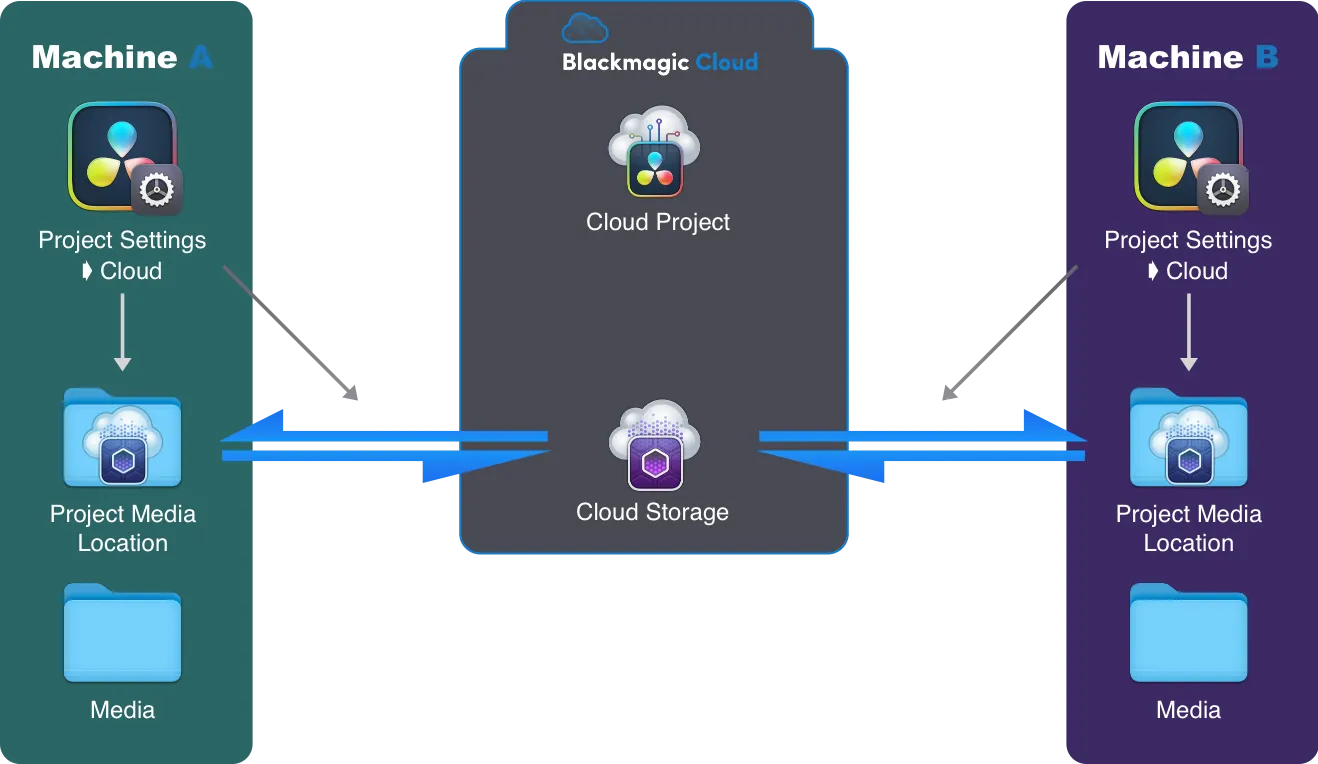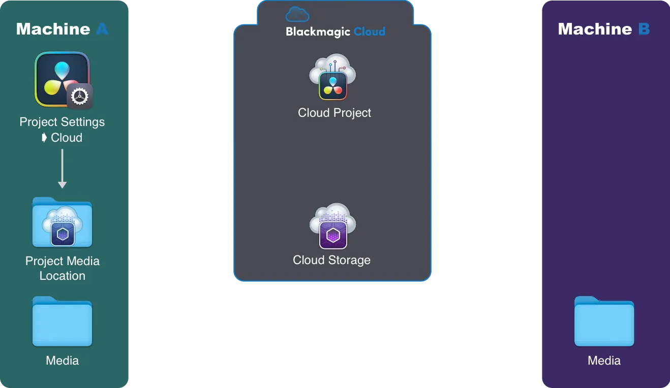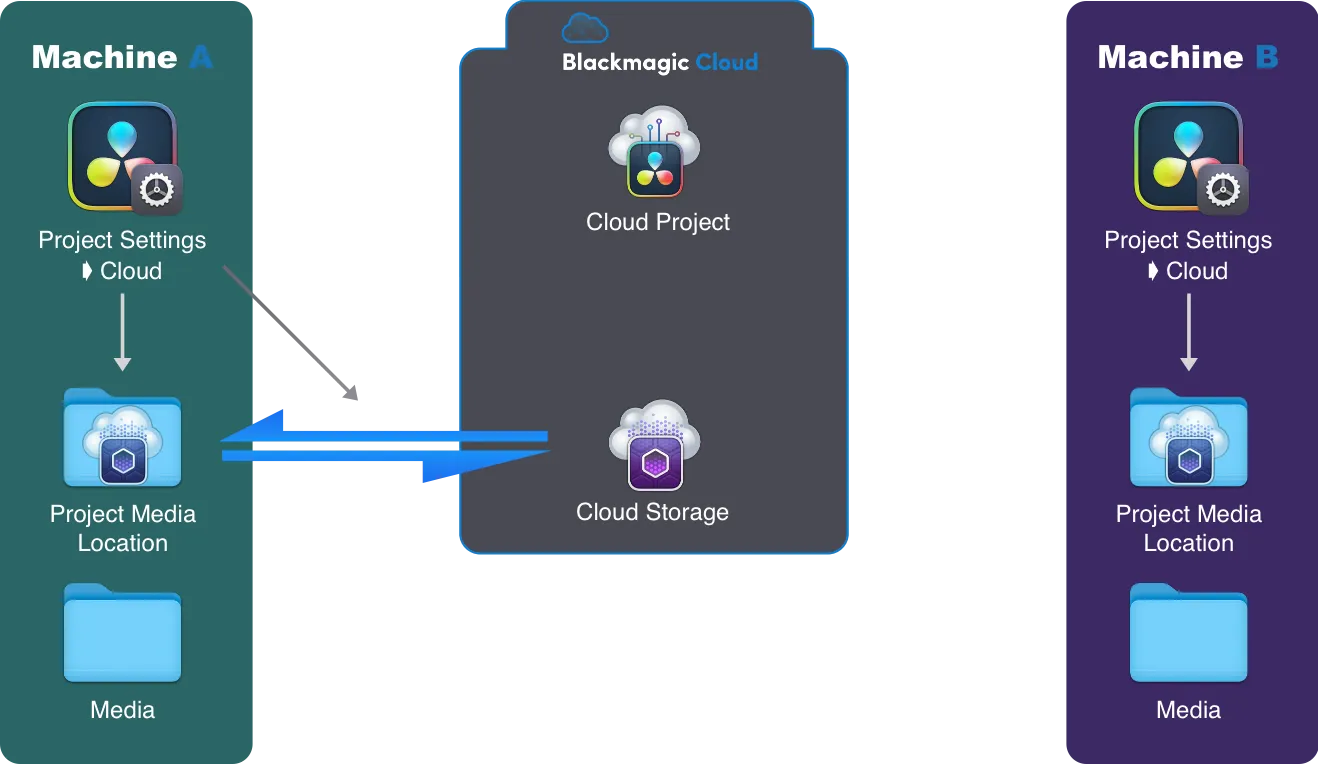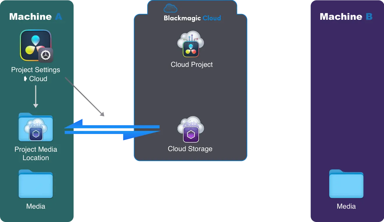 - Le 2 est le plus important : on définit un dossier sur la Machine A comme étant le Resolve Media Location. C’est ce dossier que resolve Synchronise avec le Cloud Storage.
