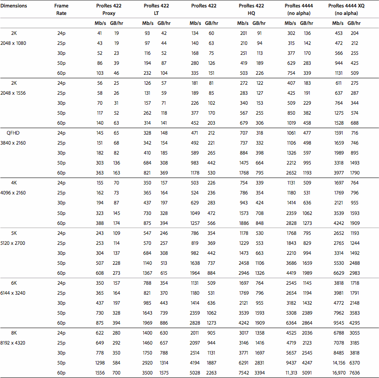 A noter que les ProRes 422 (HQ)/standard/(LT)/(Proxy) ont un sous-échantillonage chromatique en 4:2:2 comme leur nom l’indique et une profondeur de 10 bit (1 milliard de couleurs).