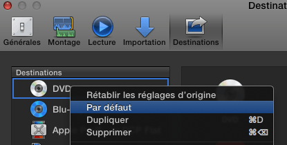 Pour changer de « destination par défaut ». Dans l’onglet Destination des préférences de Final Cut Pro X puis Clic droit ➧ par défaut