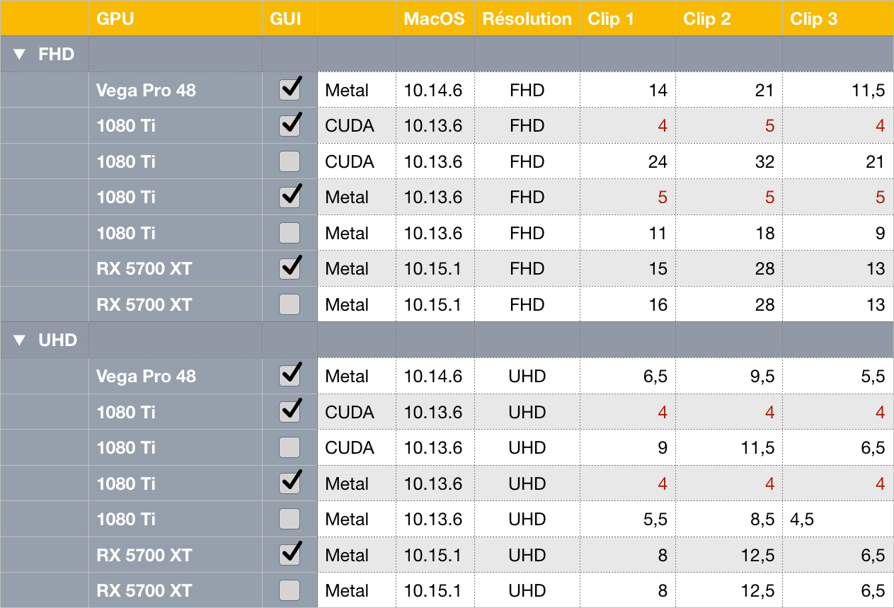 The results are in « fps » (frame per second)- Imac 2019 – Core i9 8 cores 3.6 Ghz – RAM 64 GB – Pro Vega 48 8GB